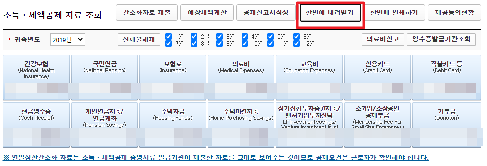 소득, 세액공제 자료조회 화면에서 한번에 내려받기를 클릭해줍니다.