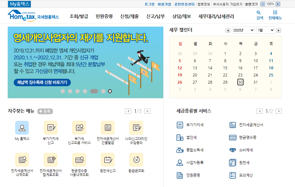 국세청 홈택스의 메인화면 입니다.