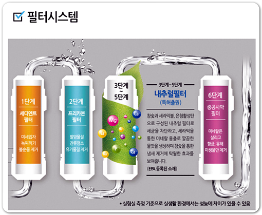 여과방식인 필터시스템의 경우, F602SW 엠와이는 6단계 필터를 적용해서 잔여물을 확실히 걸러주는 듯 하다.
