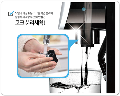 또한, 정수기의 마개 (코크) 부분은 물때가 가장 잘 끼는 부분이기도 한데, 이부분을 분리세척이 가능하게 설계하여 관리가 용이하다.