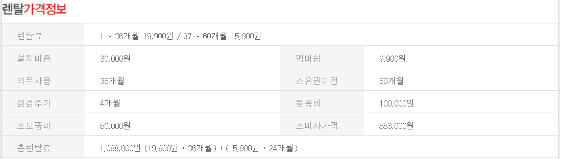 F602SW 엠와이의 총 렌탈료의 가격은 100만원에 근접한 가격이며 멤버쉽 가입시에는 등록 설치비가 면제된다고 한다.