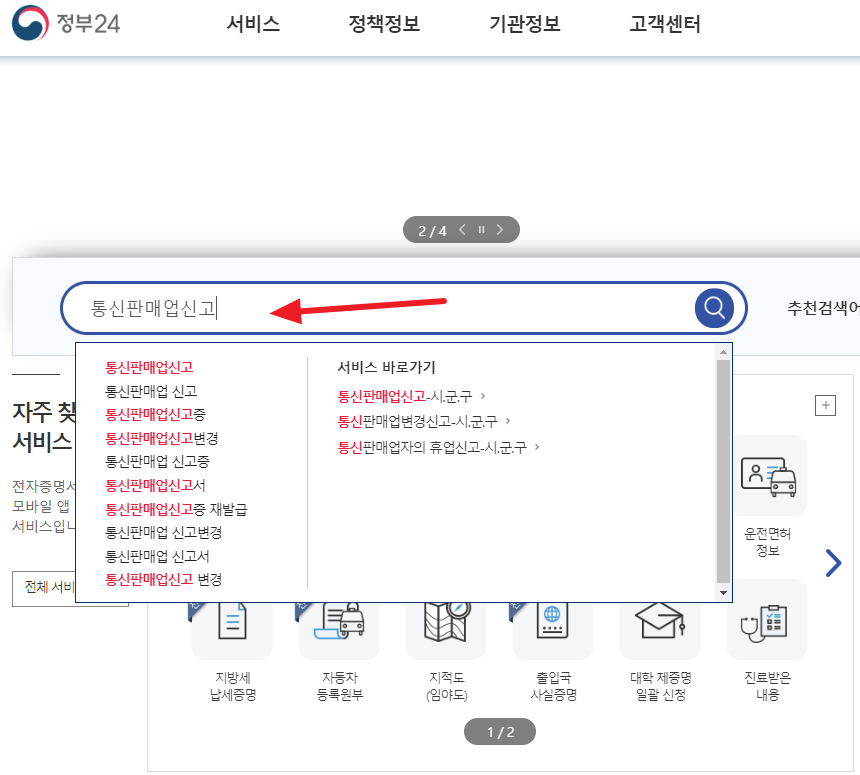 정부24 로그인 및 공인인증서를 준비하셨다면, 검색어에 '통신판매업 신고'을 입력하셔서 통신판매업 신고 메뉴에 들어가도록 하겠습니다.