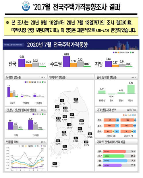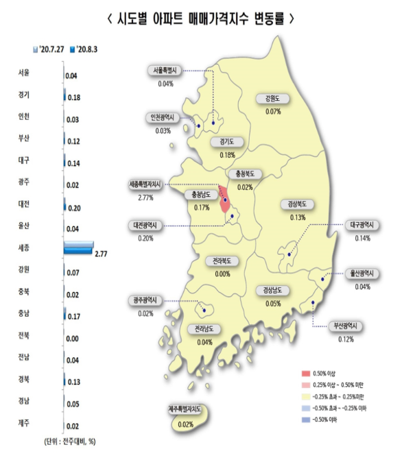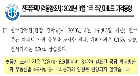 8월 6일에 발표된 한국감정원의 보도자료에 따르면, 8월 첫째주 기준, 전국의 주간 아파트 매매 가격은 0.13% 상승, 전세 가격은 0.2%가 상승했다고 합니다.