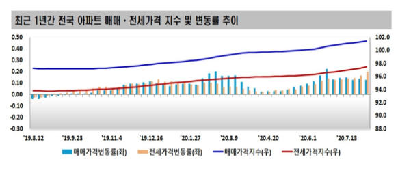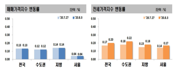 8월 6일에 발표된 한국감정원의 보도자료에 따르면, 8월 첫째주 기준, 전국의 주간 아파트 매매 가격은 0.13% 상승, 전세 가격은 0.2%가 상승했다고 합니다.