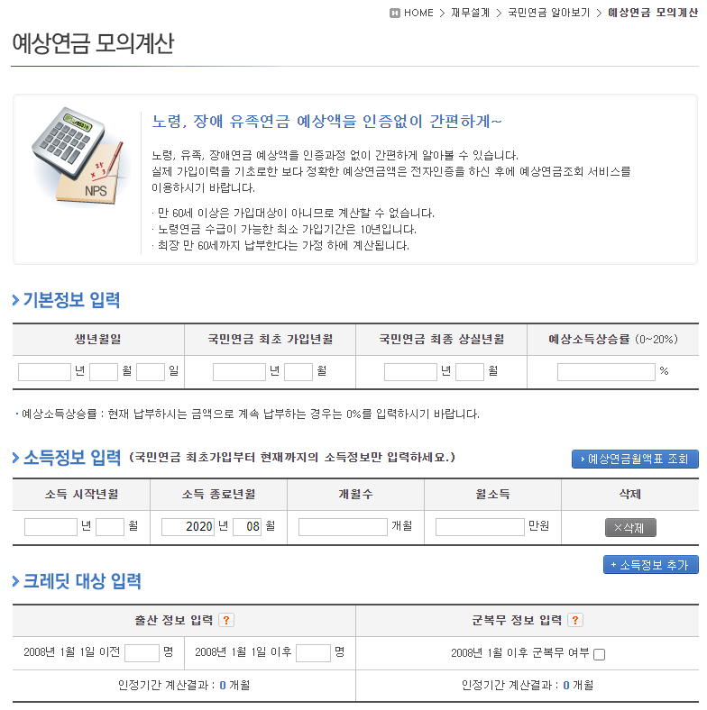 정확한 조회결과를 원하신다면, 공인인증서 로그인 후 NPS 전자민원서비스 에서 모의계산 말고 국민연금 가입내역 조회 및 국민연금 예상연금액 조회를 눌러 확인하실 수 있습니다.