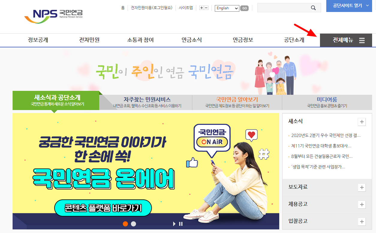 국민연금공단 홈페이지 바로가기 - https://www.nps.or.kr/jsppage/main.jsp