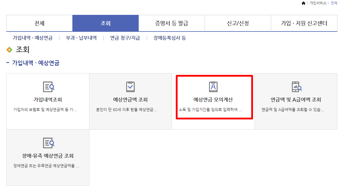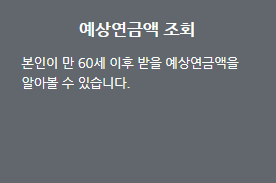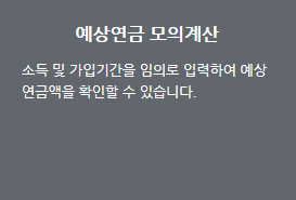 다만, 예상연금 모의계산 항목은 본인이 직접 입력해서 모의계산을 해보는 메뉴로, 본인인증절차를 거쳐서 신원조회후 나오는 결과와는 다소 다를 수 있습니다.