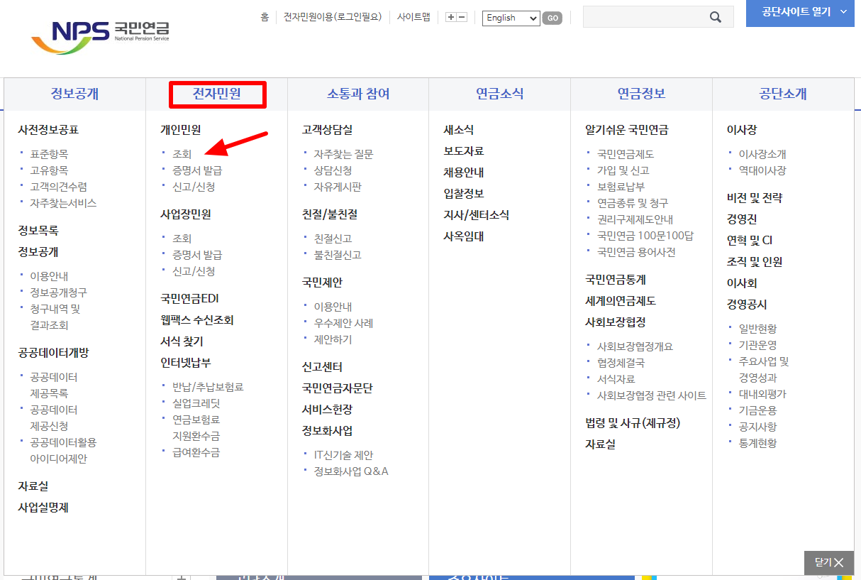 국민연금공단 홈페이지에 접속하셨다면, 우측상단의 전체메뉴를 눌러 모든 메뉴를 열어주도록 합니다. 그리고, 전자민원쪽 메뉴를 보시면 '조회' 메뉴가 있는데 '조회'를 눌러서 국민연금 수령 예상액을 조회해볼 수 있습니다.
