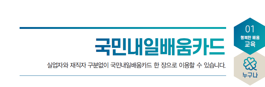 원래 2019년도 까지는, 재직자 내일배움카드, 실업자 내일배움카드 등 재직자와 실업자를 구분하여 각각 카드가 다르게 발급되었었는데, 2020년도부터는 재직자와 실업자 구분없이 한장의 '국민 내일배움카드'로 통합, 변경됨에 따라 더 사용하기가 편리해졌습니다.