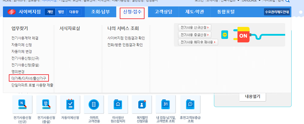 메인 메뉴 -> 신청, 접수 -> 대가족/다자녀/출산가구 카테고리로 들어가시면 전기요금 복지할인 혜택을 신청하실 수 있습니다.