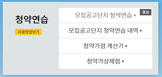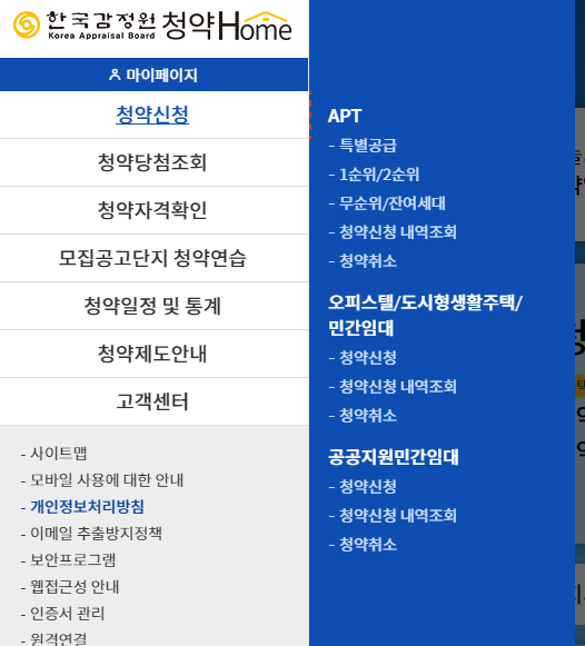 한국감정원 청약홈 홈페이지에 접속하셨다면, 왼쪽의 메뉴에서 청약신청이나 청약당첨 조회, 청약통장 순위확인 등 아파트 청약과 관련된 다양한 내용들을 확인하실 수 있습니다.