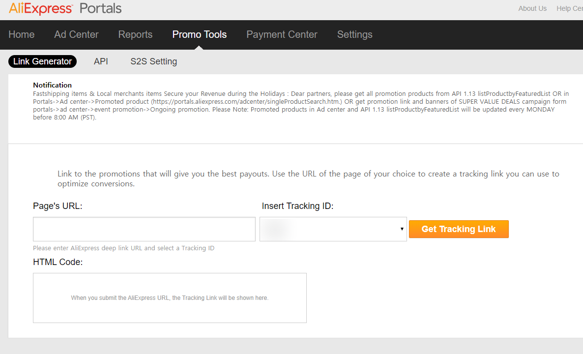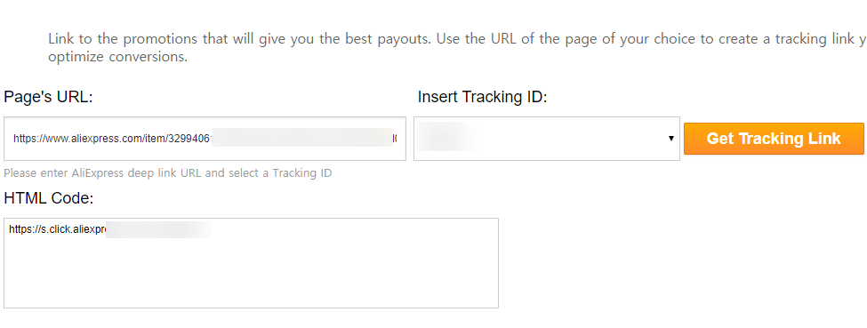 Promo Tools -> Link Generator 에 들어가시면 알리익스프레스에 올라온 제품에 코드를 삽입한 링크를 만들 수 있습니다.