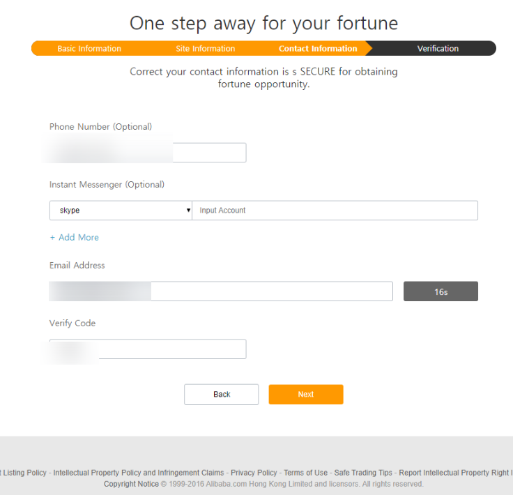 전화번호와 메신저 정보는 기입하지 않아도 되지만 이메일주소는 반드시 기입하여 인증코드를 받아 회원가입을 합니다.