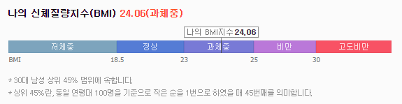 저의 경우에는 신체질량지수가 23.12가 나와서 과체중으로 측정이 되었는데 정상 체중의 범위를 약간 벗어난것으로 확인되어 조금 더 운동을 열심히 해야 한다는 지표가 나왔네요.