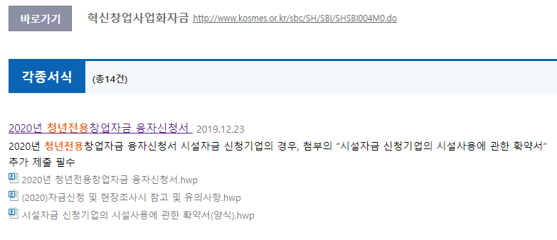 중소벤처기업진흥공단 청년전용 창업자금 서식 다운로드