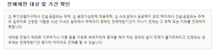 생활법령정보 공식 홈페이지 > 아파트 분양받기 탭에 들어가시면, 전매제한 대상 및 기간확인이 가능한데 여러가지 상황에 대한 전매제한 기간 및 예외 사례에 대해 나와있으니 한번쯤 둘러보시는것도 좋을 듯 합니다.