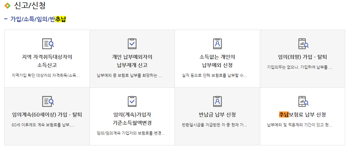 국민연금공단 홈페이지에 접속하신 후, 전자민원 > 개인민원 > 신고/신청 탭에서 '추납보험료 납부 신청' 메뉴에 들어가겠습니다. 해당 페이지에서는 국민연금 추납뿐만 아니라, 국민연금의 가입내역조회, 예상연금액조회, 예상연금 모의계산 등 여러가지 업무가 가능하니 한번쯤 살펴보셔도 좋을 것 같습니다.