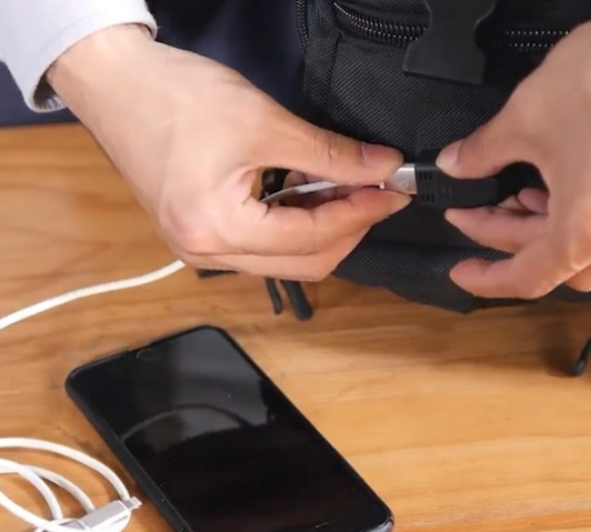 또한 외부에는 usb 포트가 있는데, 내부에 보조배터리를 넣어놓고 외부에 선을 연결하여 가방을 맨 상태로 휴대폰 충전이 가능하다.