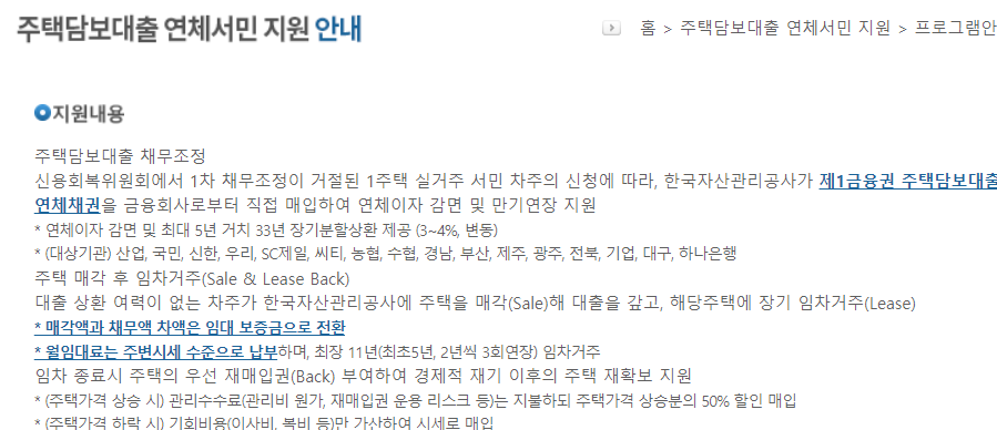주택담보대출 채무조정 프로그램으로 신용회복위원회에서 1차 채무조정이 거절된 1주택 실거주 서민은 한국자산관리공사가 연체채권을 금융회사로부터 직접 매입해서 연체이자를 감면해주거나 만기연장을 지원해주는 제도인 주담대 연체 서민지원 프로그램을 이용해볼 수 있겠습니다.