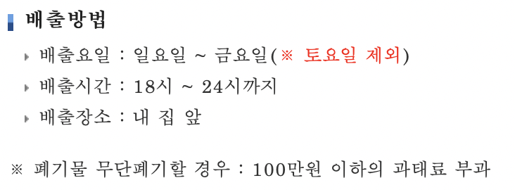 관악구의 경우 토요일을 제외한 일요일부터 금요일까지 운영되며, 배출시간은 오후 6시부터 밤 12시까지 입니다.