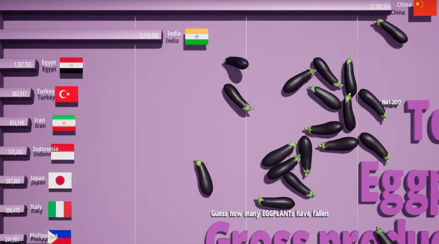 (참고로 중국의 가지 생산량은 세계 1위이며 넘사벽이다. 가지 강국 정도로 생각하면 될듯하다)
