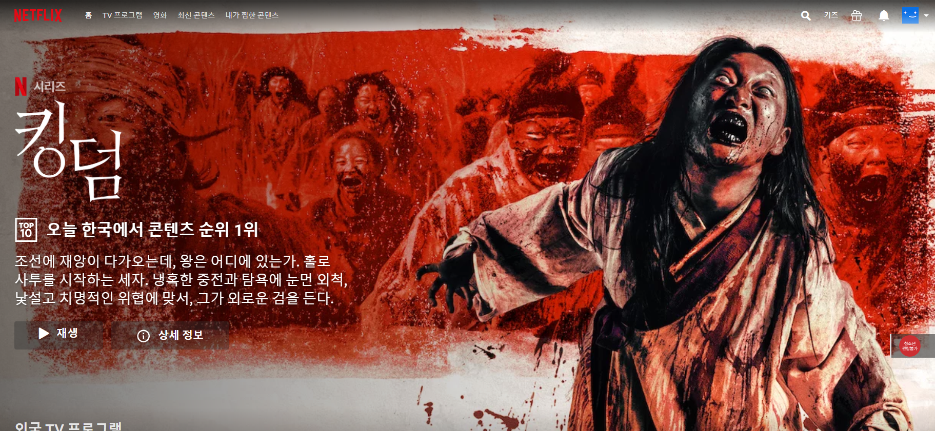 최근 킹덤 시즌 2가 공개되어 메인에 걸려있습니다.