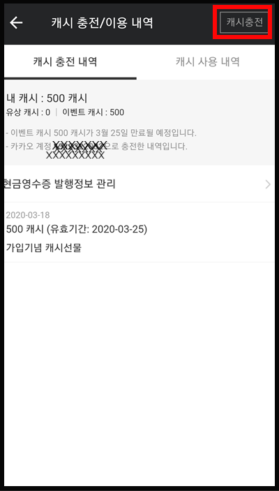 오른쪽 상단의 캐시충전을 탭 합니다.