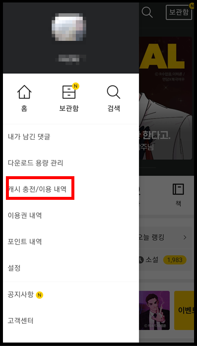 캐시 충전 / 이용내역 버튼을 탭 해줍니다.