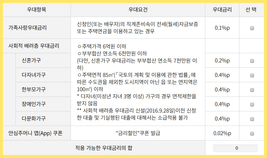 우대금리 사항을 꼼꼼히 잘 계산해 따져보면, 낮은 금리로 안정적인 주택담보대출을 이용할 수 있겠습니다.