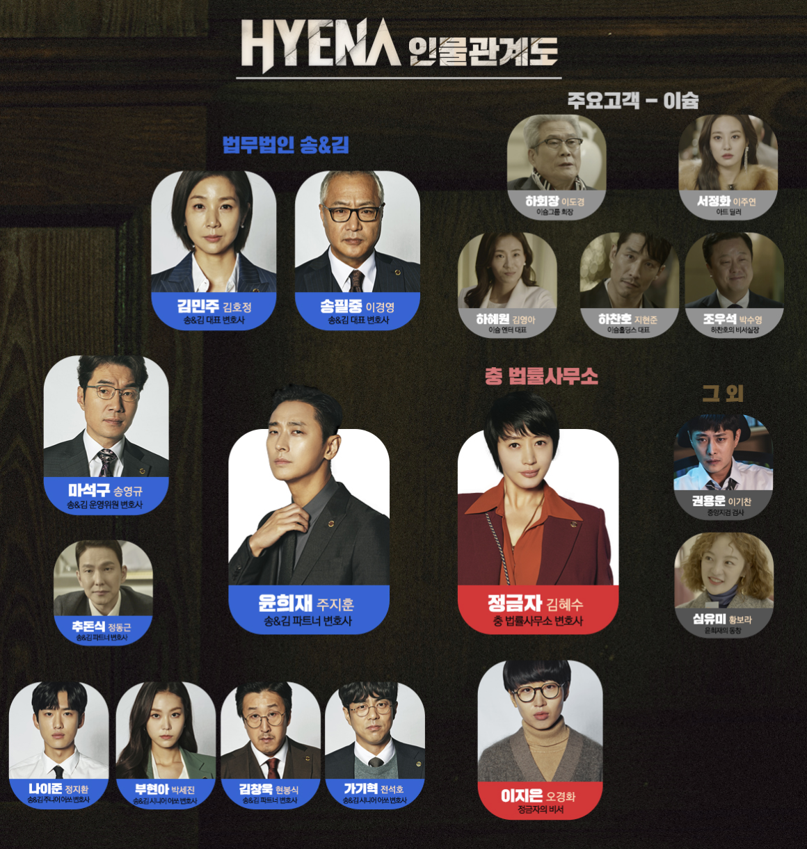 드라마 '하이에나' 에서는 이렇게 '하이에나' 같은 이미지를 대한민국의 엘리트 '변호사' 직군에 녹여내 '돈'과 '부패'에 얽힌 피튀기는 스토리로 나쁘지만 꽤나 매력적인 드라마로 잘 풀어나가고 있다.