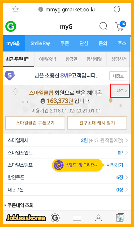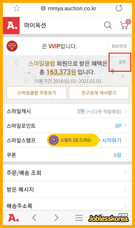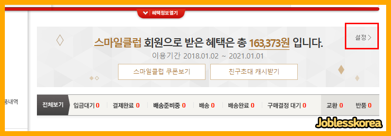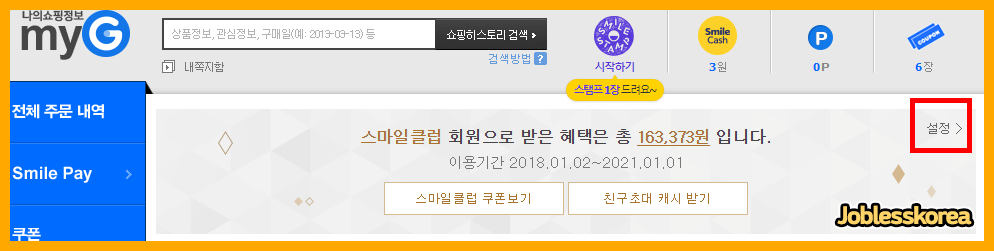 옥션과 마찬가지로 설정 버튼을 눌러 스마일 클럽 설정 페이지로 들어갑니다.