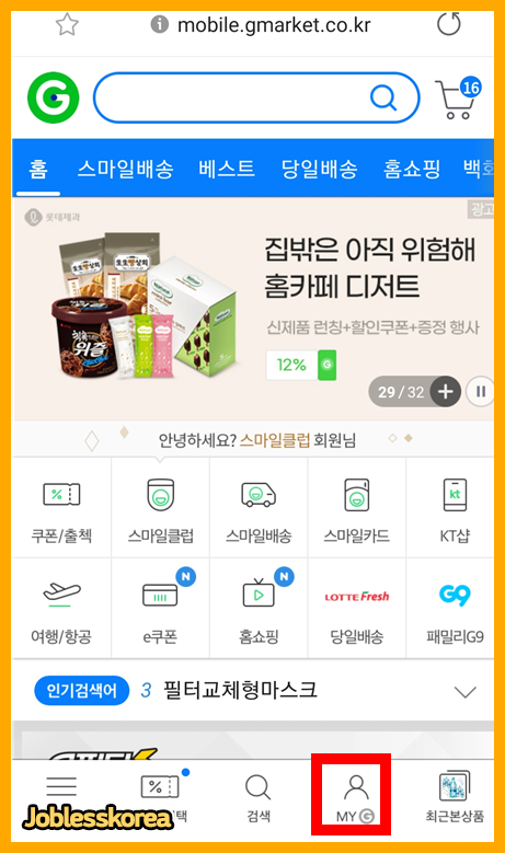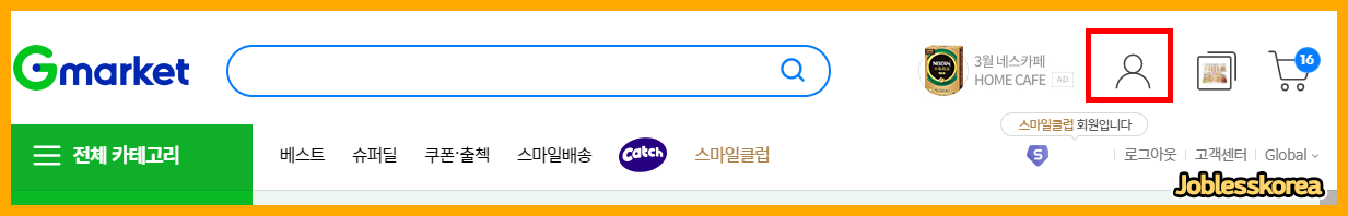 PC 환경에서의 지마켓 메인 페이지 입니다. 마이 페이지에 접속하기 위해 내 아이콘을 클릭합니다.