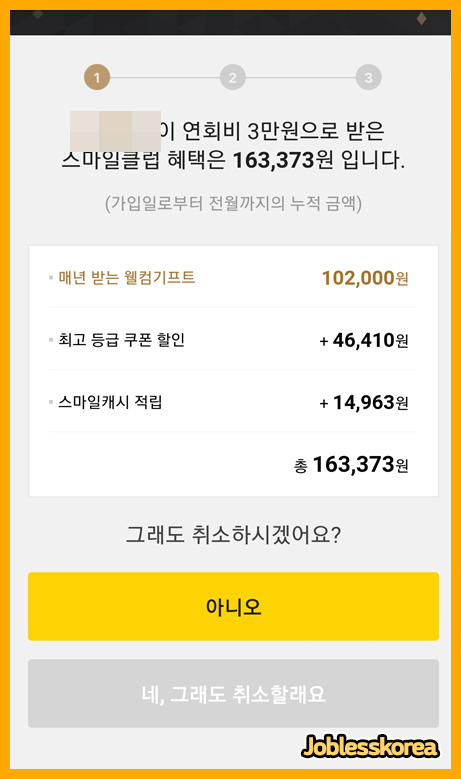 스마일클럽 멤버십 서비스는 첫 달 무료이용도 해볼 수 있는데, 한달 무료 이용 이후에는 3만원의 연회비가 결제가 되니 멤버십 유지를 원치 않는 분들은 자동연장을 해지해야 겠죠?