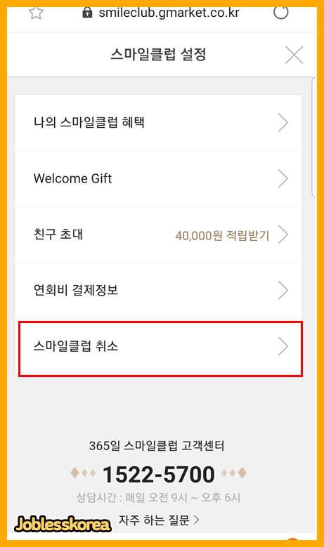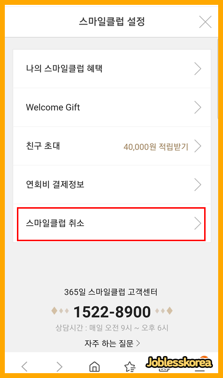 스마일클럽 취소 메뉴에 들어가 해지절차를 진행합니다.