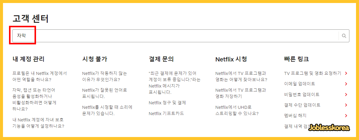 고객센터의 검색창에 '자막' 이라고 입력합니다.