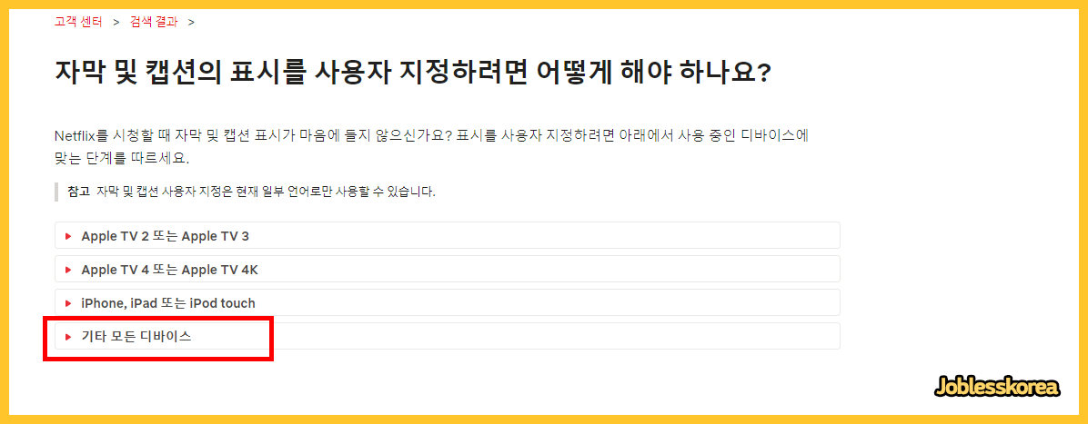 프로필 관리나, 계정 설정 메뉴에서는 '자막 표시 설정' 메뉴를 찾을 수 없습니다. 왜 자막을 커스텀 할 수 있는 메뉴를 숨겨두었는지 의문이지만, 아무튼 고객센터 메뉴로 들어가보도록 하겠습니다.
