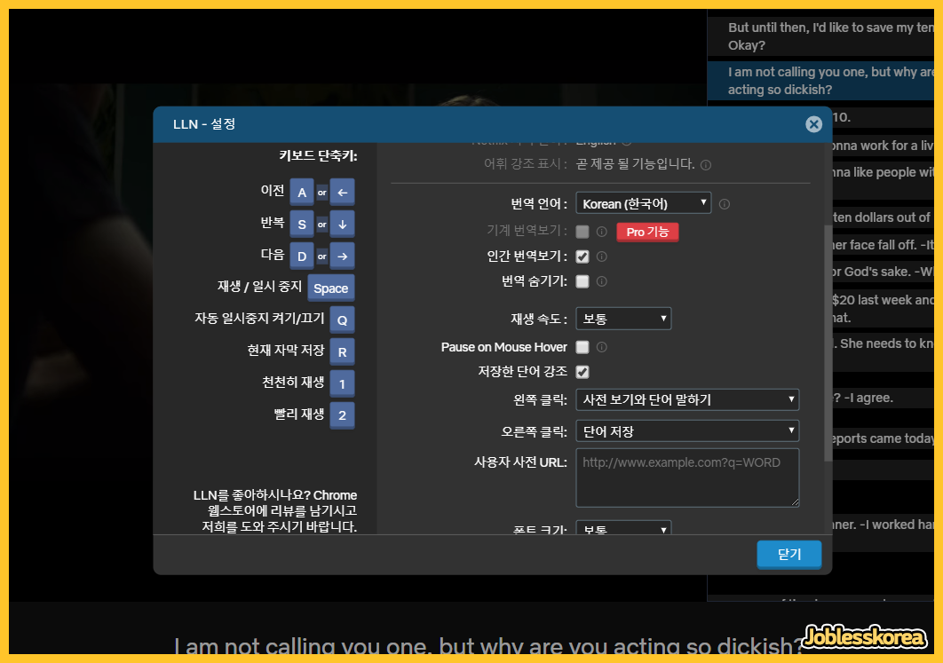 개인적으로 방향키로 빠르게 대사를 넘어다닐 수 있고, 쉐도우 스피킹을 할 때에, 발음들이 입에 붙을때 까지 반복시킬 수 있는 기능이 아주 좋았습니다.😙