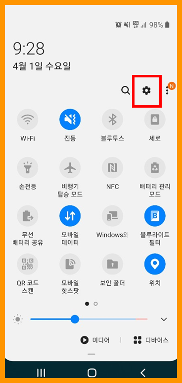 상단의 상태바를 아래로 당겨, 톱니바퀴(설정) 버튼을 눌러줍니다.