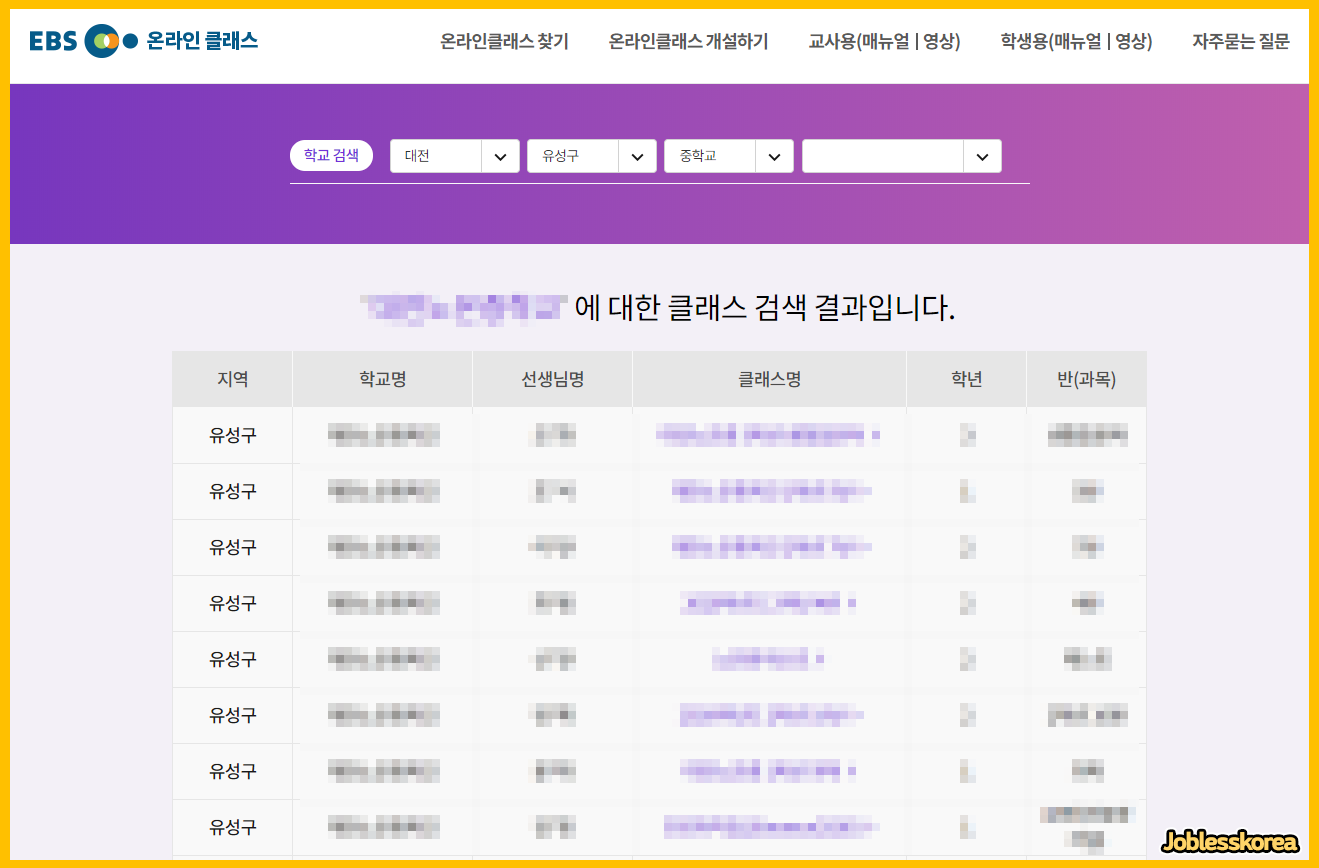 각 지역별 학교를 검색, 학년을 선택한 후 수업을 신청하시면 됩니다.