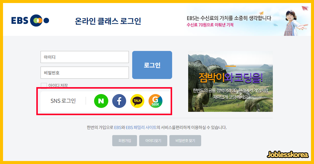 아직 회원가입을 하지 않은 상태라면, EBS 온라인 클래스의 '회원가입'이 아닌 '로그인'을 먼저 클릭하시면 SNS 로그인 버튼을 확인할 수 있습니다.