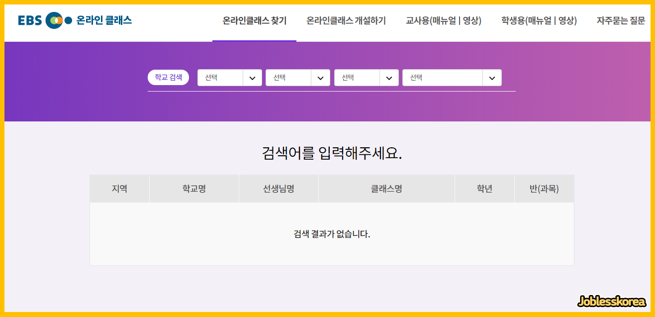 각 지역별 학교를 검색, 학년을 선택한 후 수업을 신청하시면 됩니다.