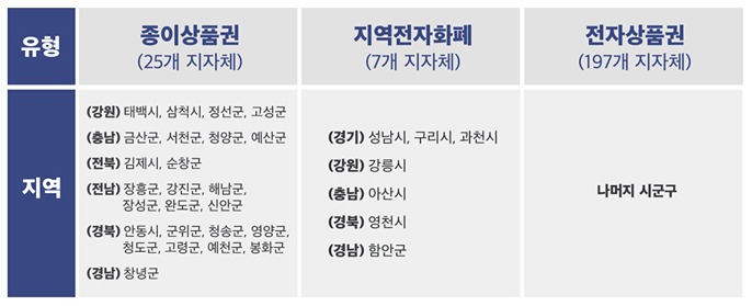 다만, 대형마트나 온라인쇼핑몰, 백화점 및 귀금속취급점이나 유흥업소 등 지역 경제 활성화와 관련이 없는 곳에서는 사용이 불가능합니다.