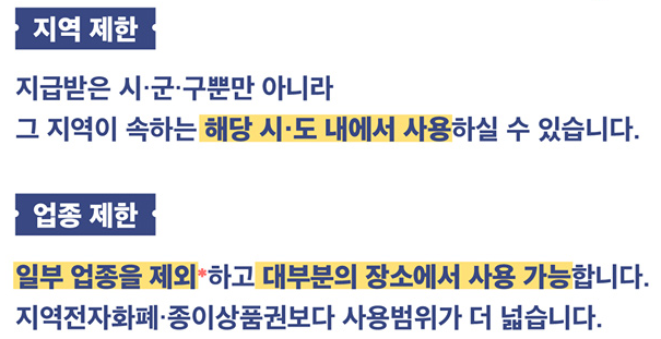 다만, 대형마트나 온라인쇼핑몰, 백화점 및 귀금속취급점이나 유흥업소 등 지역 경제 활성화와 관련이 없는 곳에서는 사용이 불가능합니다.