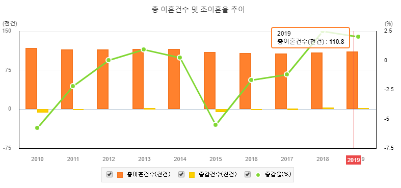 한국의 경우 통계청 공식자료 기준 2018년도에 약 25만 7천쌍의 커플들이 결혼하였고, 같은해 10만 8천쌍의 커플들이 이혼을 했다.