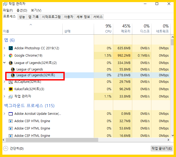 그런다음, 앱에 보이는 리그오브레전드 (32비트) 아이콘을 우클릭 후 작업끝내기를 눌러준다.