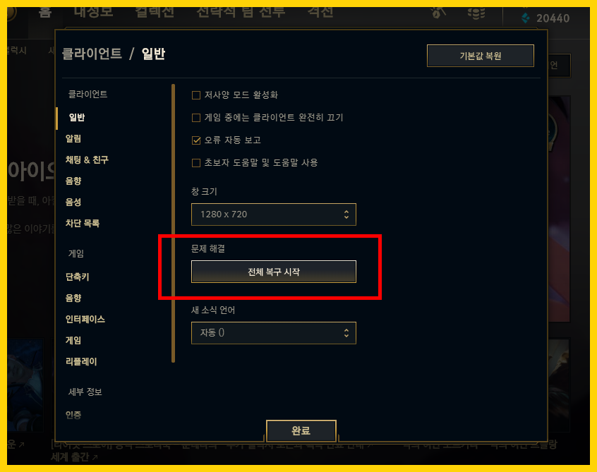 라이엇 게임즈에서는 이런 오류상황에 대비해 롤 클라이언트 복구 옵션을 넣어두었다.