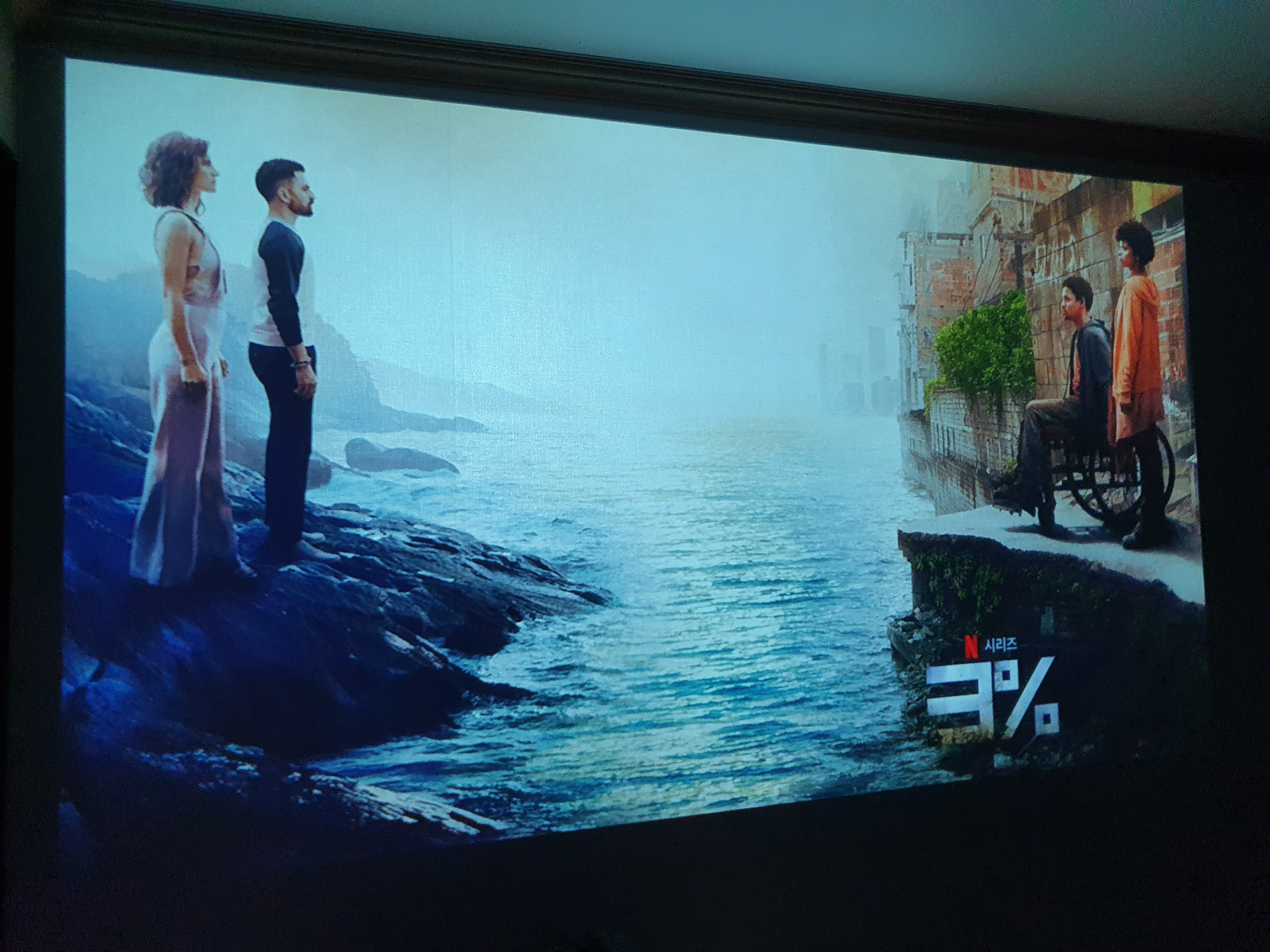 물론, 빔 프로젝터 전용 스크린을 사용한다면 더 쨍하고 선명한 화질을 얻을 수 있겠지만, 지금 상태에서도 가볍게 넷플릭스를 즐기기에는 불편하지 않아 그냥 쓰고 있다.