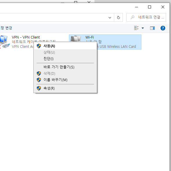 그러면 위와같이 네트워크 어댑터 목록이 나오게 되는데, 와이파이 ap 무선랜카드 아이콘을 우클릭해서 "사용안함 -> 사용" 으로 바꾸어주면 와이파이 오류가 해결될 수 있다.